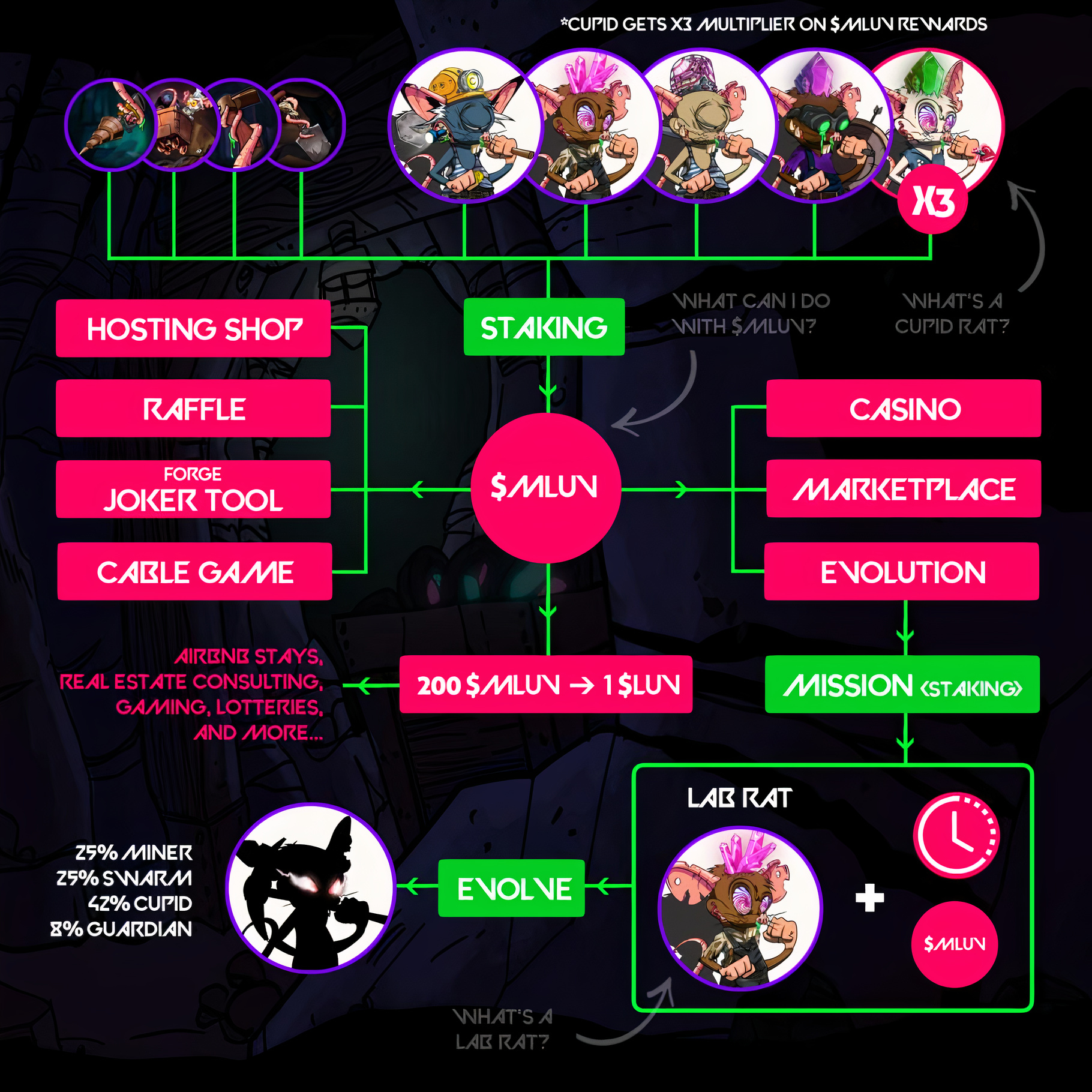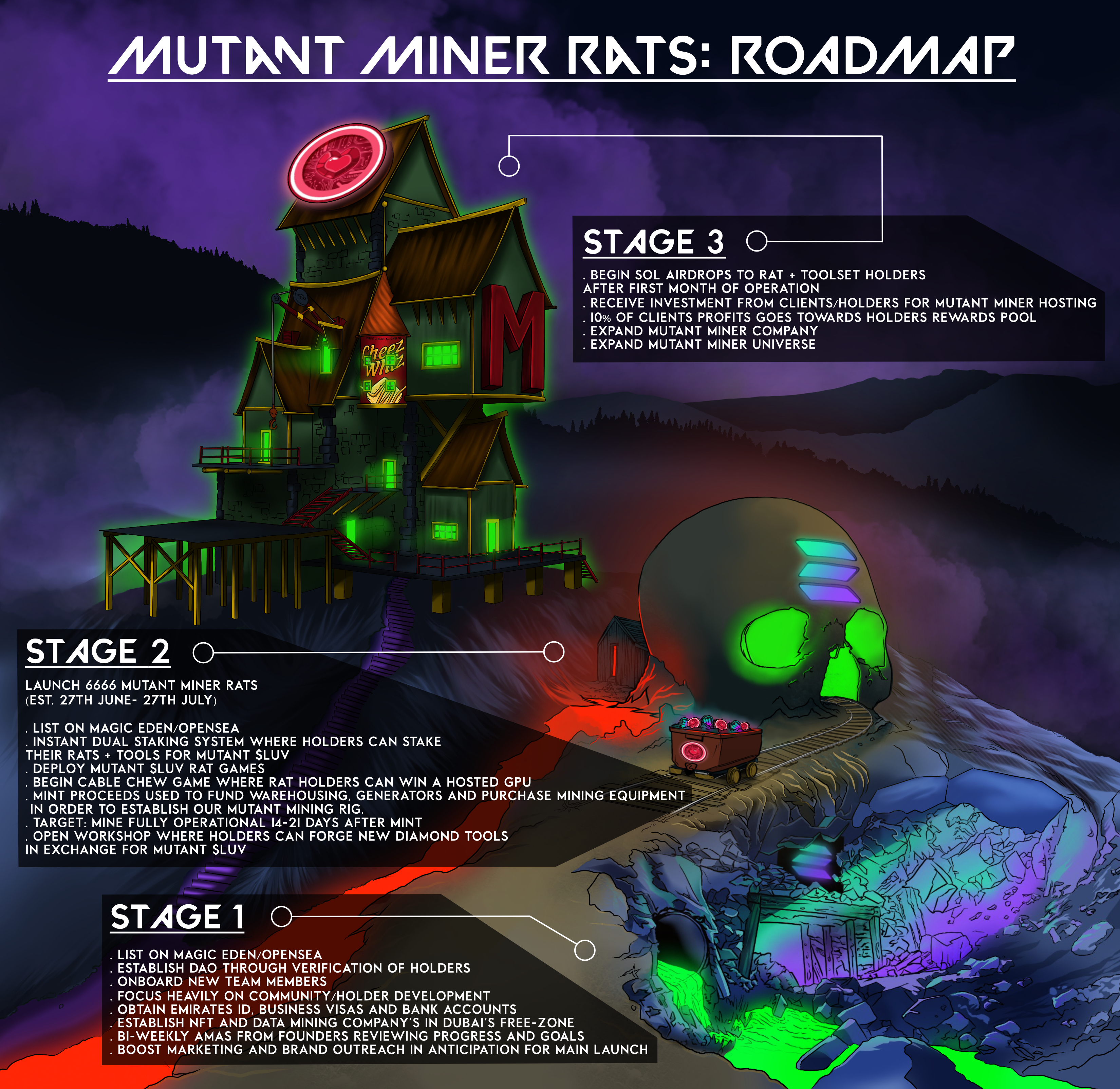 Only rat that can be staked alongside Mutant Miner Tools to recieve profit sharing via Solana Airdrops.